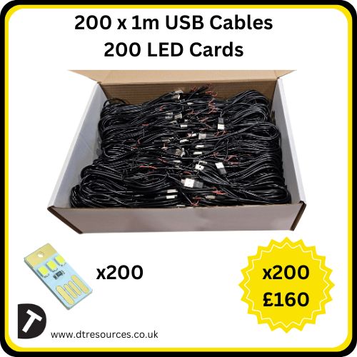 This is the very best price we think you'll find - 200 x 1m USB Cables and 200 LED Cards, this can be used to support a whole year group design and make a lamp for just 80p each!